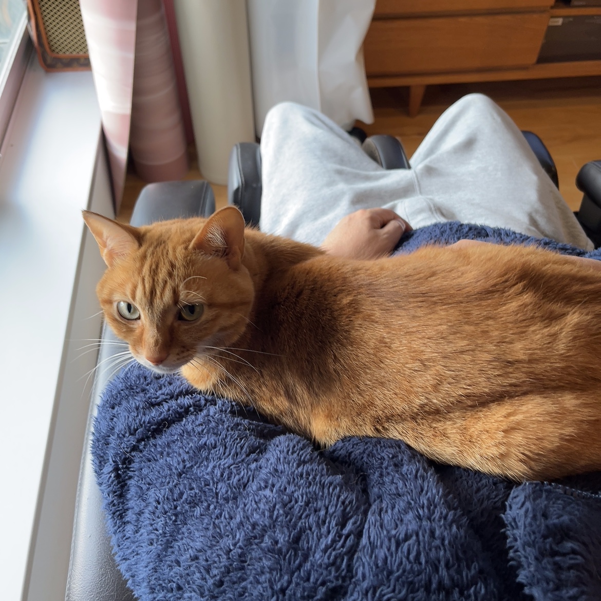 いないなあ、思ったら、マッサーに乗っている夫に乗っていた